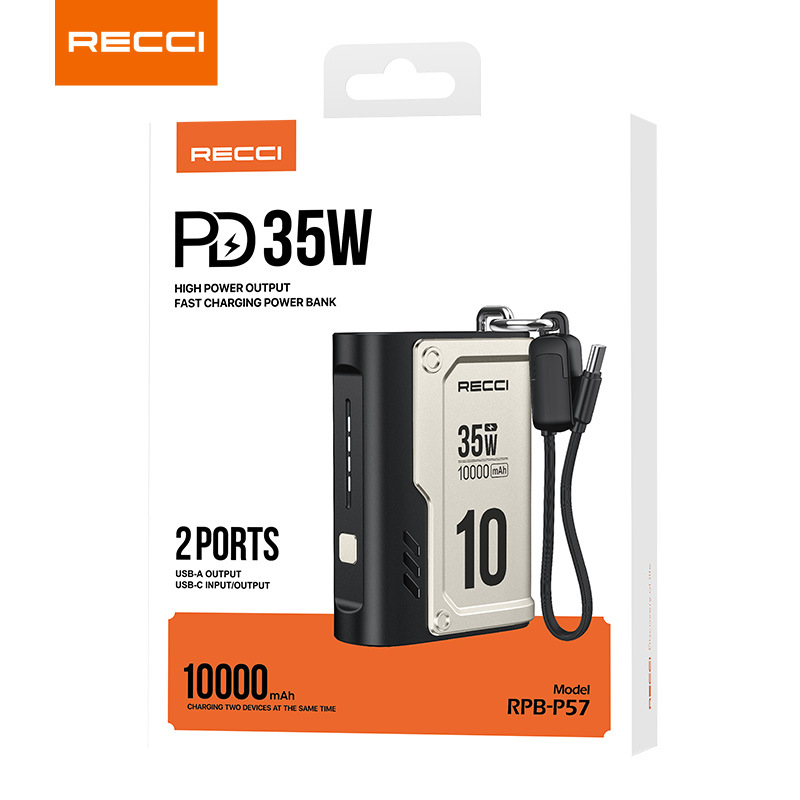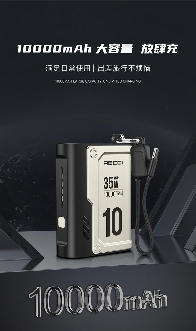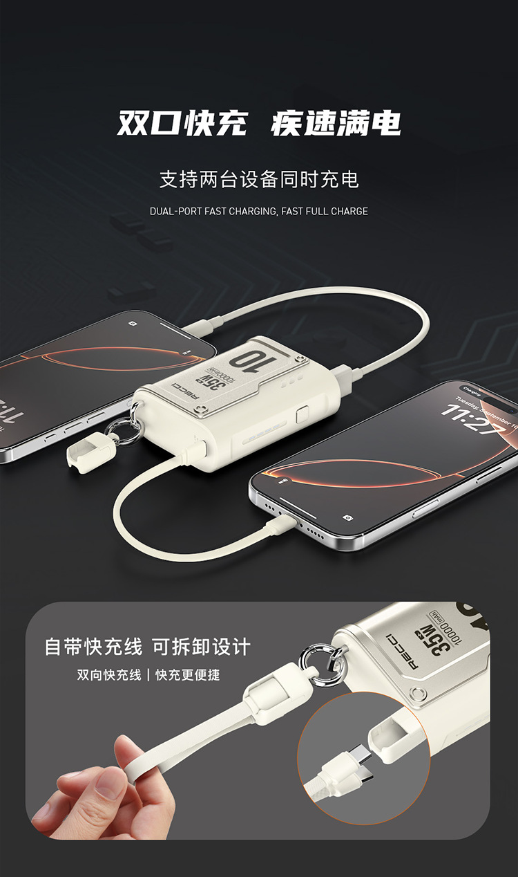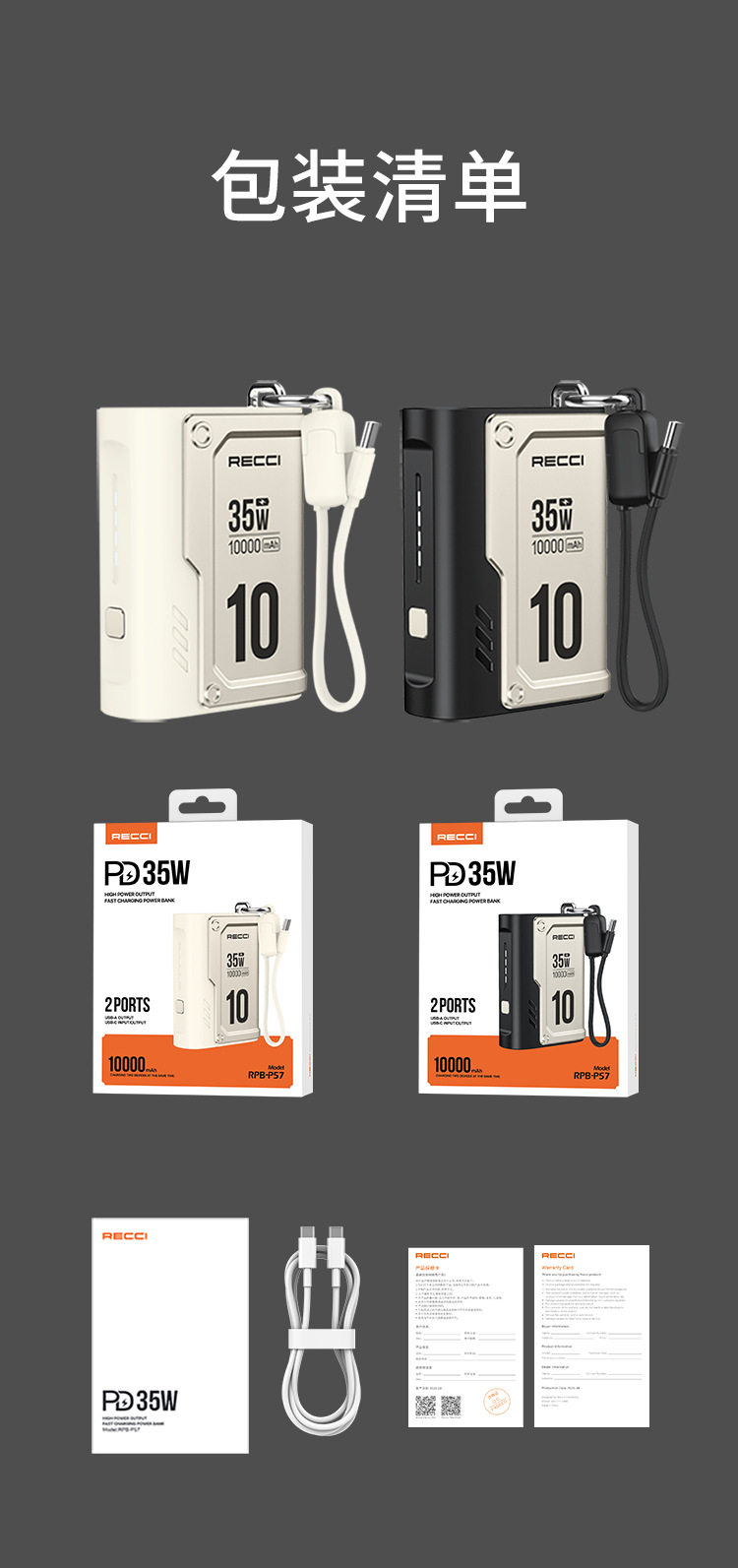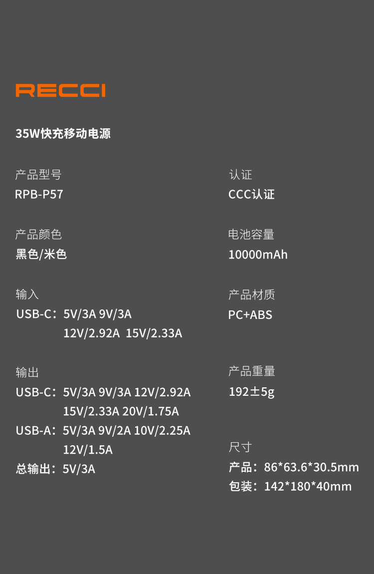RECCI锐思RPB-P57自带线双输入PD35W快充移动电源支持笔记本充电